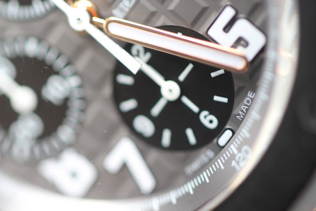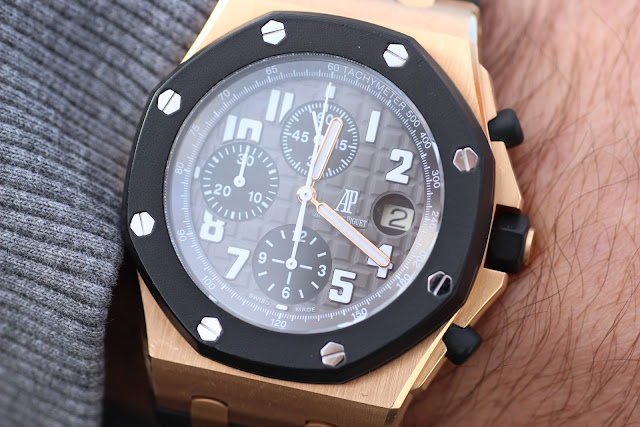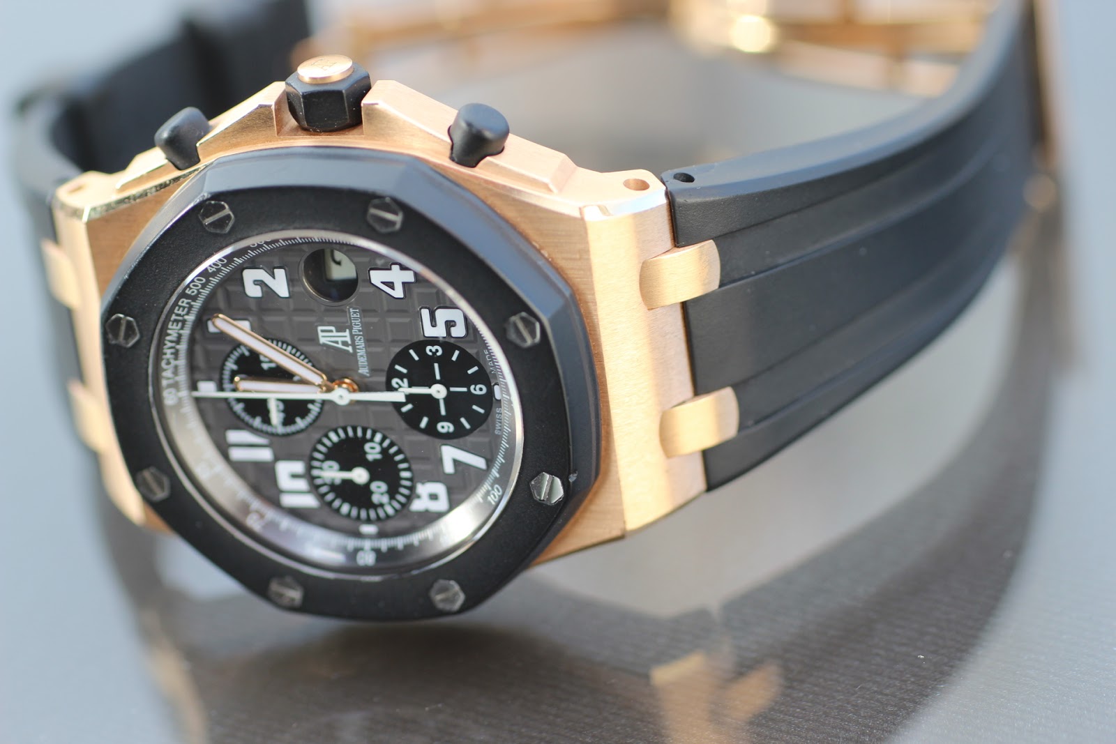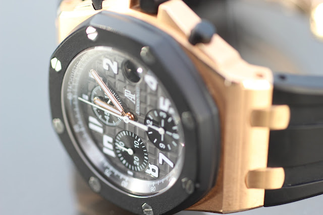 Audemars Piguet belongs to one of the best Swiss watchmanufactures. The Roval Oak Offshore (ROO), a popular Gerald Genta design, is considered their most iconic timepiece. While there are many limited editions made of all kinds of materials including Titanium, Carbon, Steel, Gold, Platinum, etc., this one is made of Rose Gold and possesses a beautiful aura and appearance. It is a heavy watch with a 41mm case. The reference is 25940. I took quite a few pictures under sunny skies on a freezing cold day in Germany outside on the garden table.