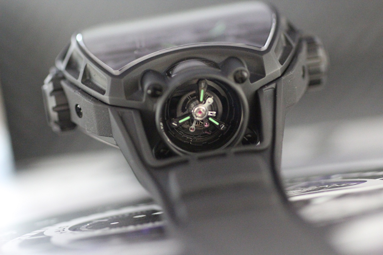 While the watch is quite huge, it does not feel heavy on your wrist, at least I did not have the impression of it being heavy. The Hublot movement carries 512 parts. On the dial, you see the 5 day power reserve. The crown on the right side allows setting of the watch while the crown on the left side allows you to slow down the watch, or speed it up, by 4 times the speed up or down. In a way, you can set “your” time with this watch. You have three setting, slower, faster, and time, which is the correct running time.