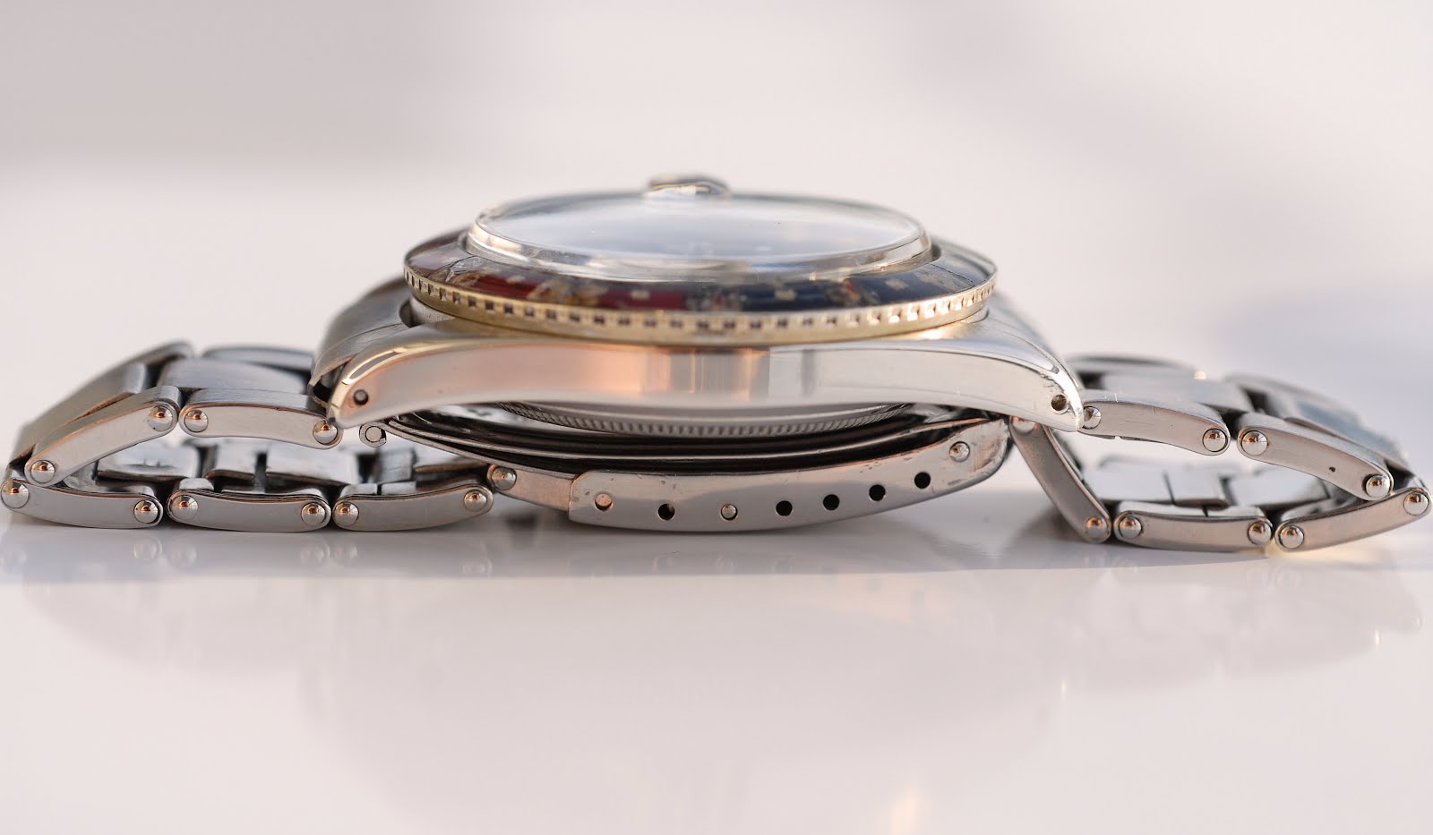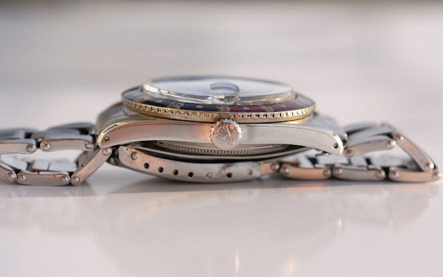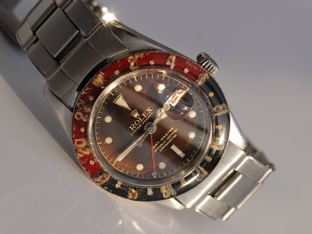 This is an all original Rolex GMT reference 6542 from the late 1950s with a true tropic brown dial, it is a swiss only radium dial. The bakelite bezel unfortunately cracked at some point and was professionally repaired by my watchmaker who used to work for Rolex. It is a beautiful example of an over 50 year old Rolex. A time long gone. Nice to catch up with the past, isn’t it? Enjoy the pictures shot by my buddy. He used the bit of sun we had today in Germany.
