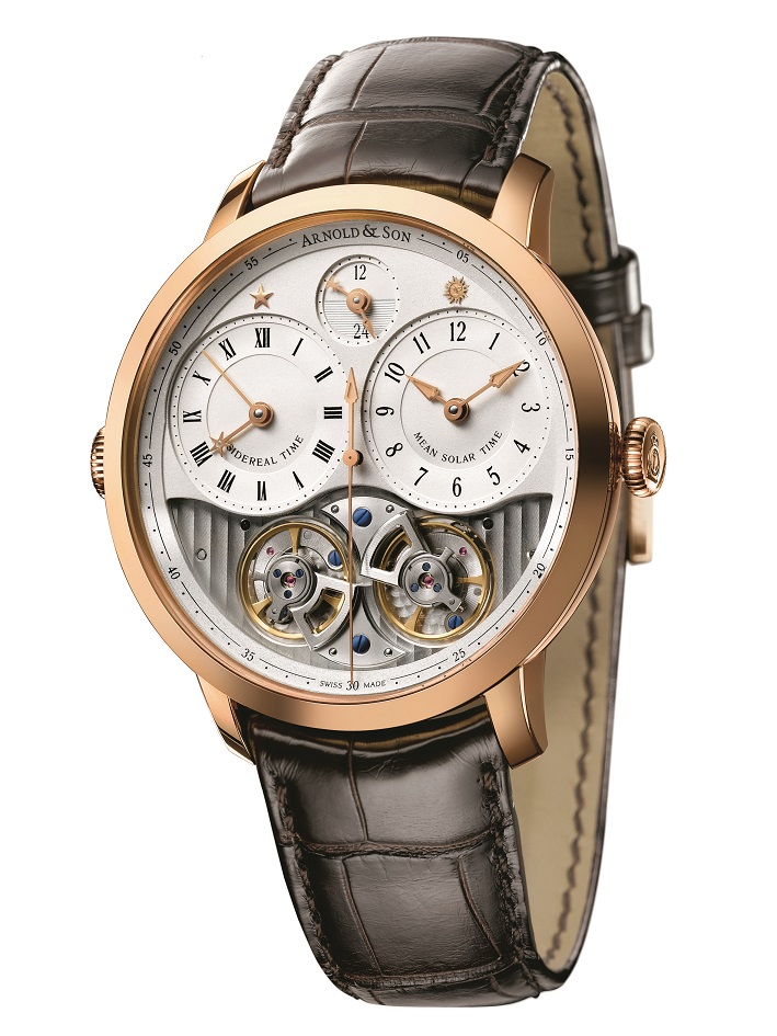 | DBS. Three initials that pay tribute to the heritage and expertise of Arnold & Son, once again placing the brand in the forefront of horological complications. Sidereal time and mean solar time (local time) appear side by side on the same dial. Between 1796 and 1799, John Roger Arnold achieved considerable feats in this field, now echoed two centuries later by the brand bearing his name. This timepiece featuring perfect aesthetic and mechanical symmetry bears two independently operating counters. Powering these two entities is an entirely in-house designed, developed and produced “mirror-type” calibre. It comprises two balances and two barrels – one running at a 24-hour speed and the other at 23 hours, 56 minutes and 4 seconds. The openworked dial provides a clear display of the two mechanisms operating side by side without interfering with each other. Doubtless liable to propel aficionados into even higher orbit are the sidereal and solar indications appearing at 12 o’clock and which are read off in 24-hour mode. | ||||||||||