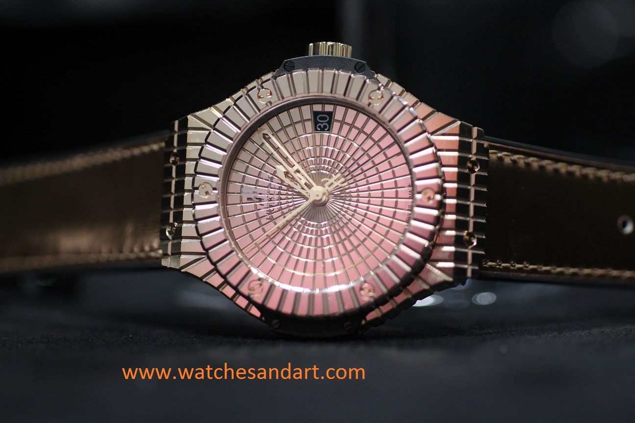 Hublot is known for watches that carry more like jewelry than just a mechanical timepiece. While they carry mechanical movements, they are made of different kinds of Gold and often are adorned with precious Stones and Diamonds. The Big Bang Caviar is one of These luxurious jewelry timepieces with a very unique look, and the bezel can either be made of red Gold or Diamond covered. The Pictures Show the red Gold bezel Version.