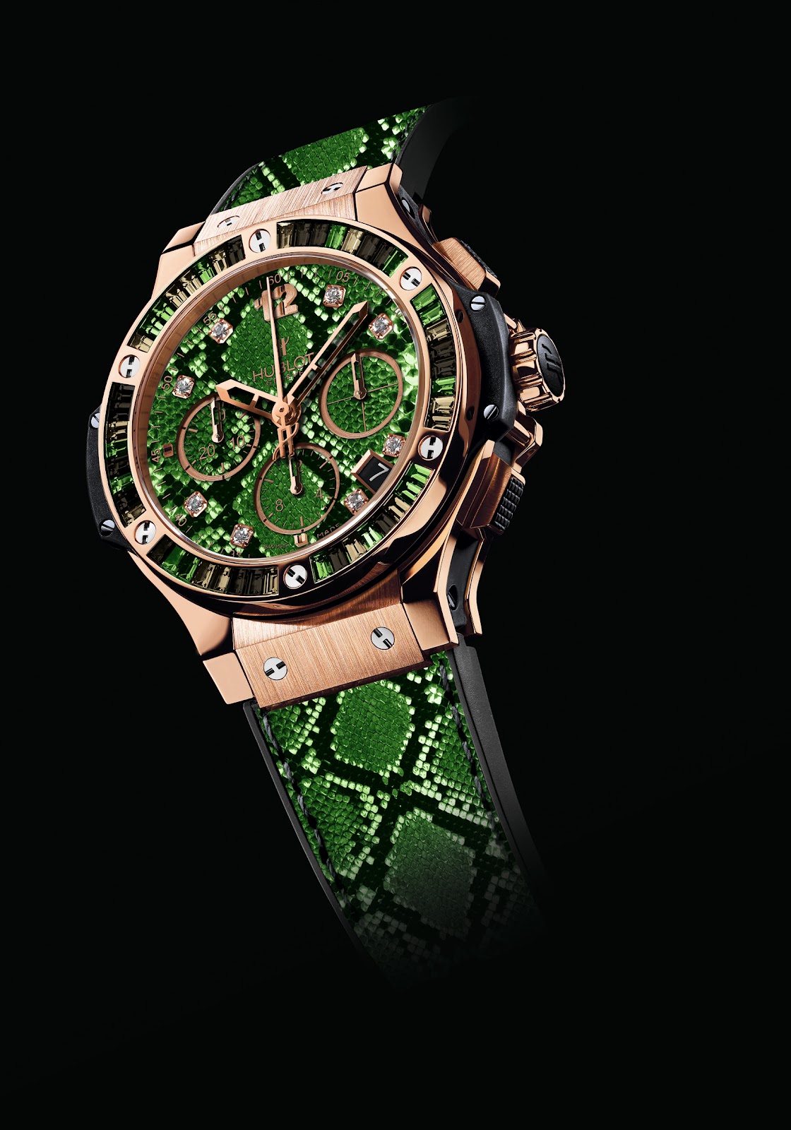 Green Boa print Hourmarkers set with 8 diamonds (0.14 cts) 30-minute, 12-hour and small seconds counters at 9, 6 and 3 o’clock Date window at 4 o’clock |