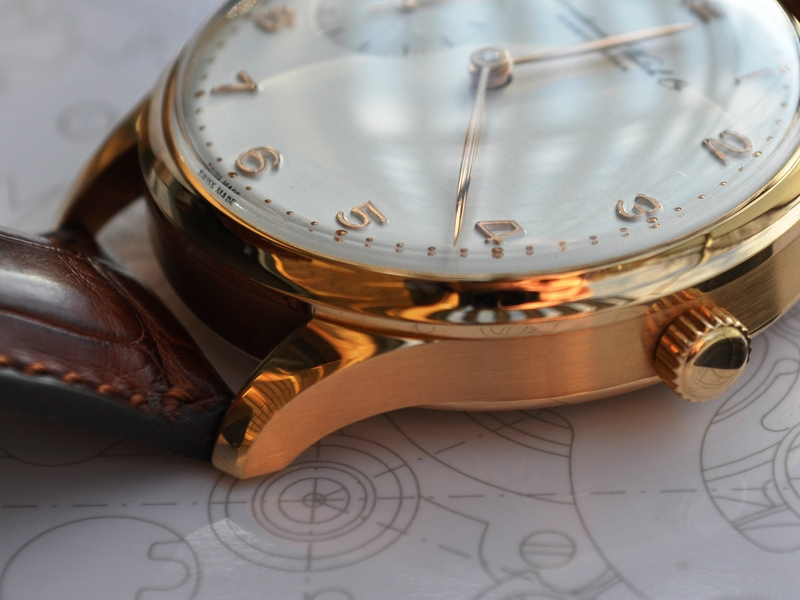 Above you see the Position of the small seconds at 9 o’clock which is due to the caliber 9x based on a pocketwatch caliber 952, the second generation of the flat bridge caliber 95.